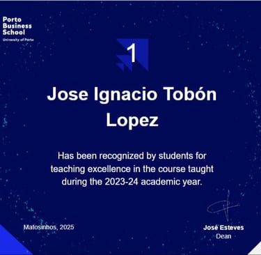 Desde hace más de 15 años soy profesor de Negociación (Negotiation Skills) en la Porto Business School (PBS). En junio de 2025 he sido reconocido como el mejor profesor de la Porto Business School (PBS) durante el año académico 2023 - 2024. La PBS está entre las primeras 100 universidades a nivel global y dentro de las 40 mejores de Europa. En Global Online MBA está en las primeras 10 universidades según Financial Times. En la mayoría de los programas está en el 10% mejor a nivel global.